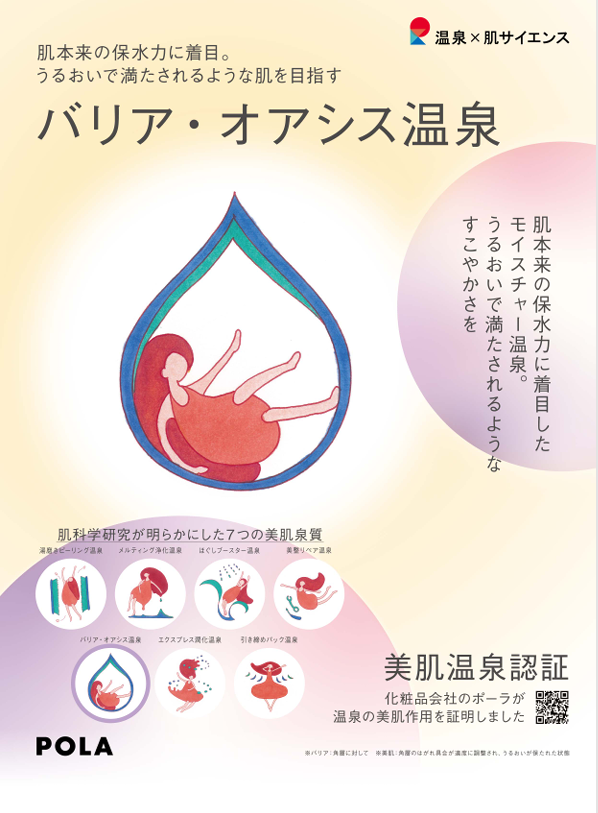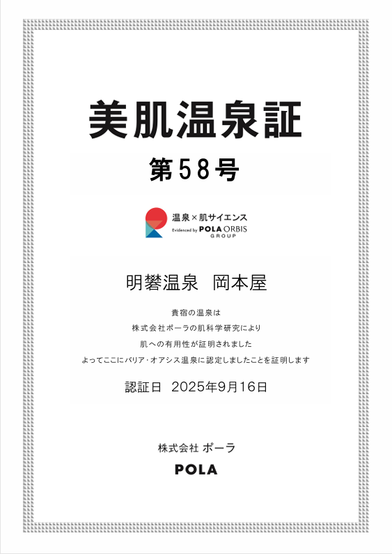 このたび、株式会社ポーラの肌科学研究による温泉水調査の結果、岡本屋の温泉は肌への有用性が証明され「バリア・オアシス温泉」に認定されました。