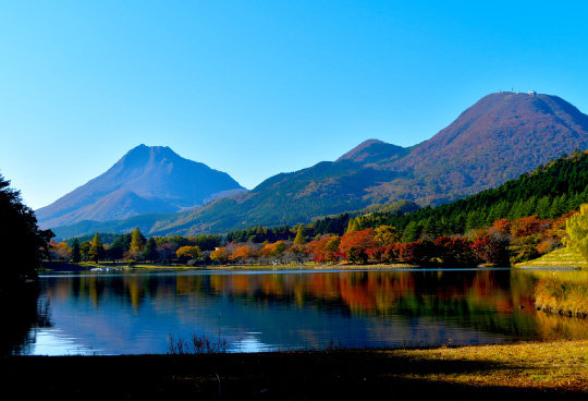 別府ロープウェイ乗り場からさらに登った先にある、標高600mに位置する志高湖は、由布岳や鶴見岳を望む静謐な場所です。